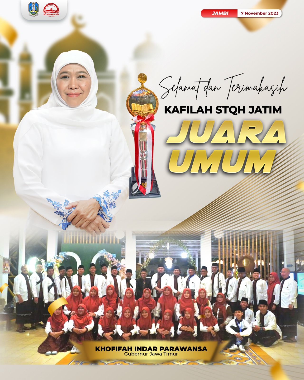 Kafilah Jawa Timur berhasil menorehkan prestasi sebagai Juara Umum dalam Seleksi Tilawatil Qur’an dan Musabaqah Al-Hadist (STQH) Tingkat Nasional XXVII yang digelar di Jambi pada 29 Oktober – 7 November 2023.