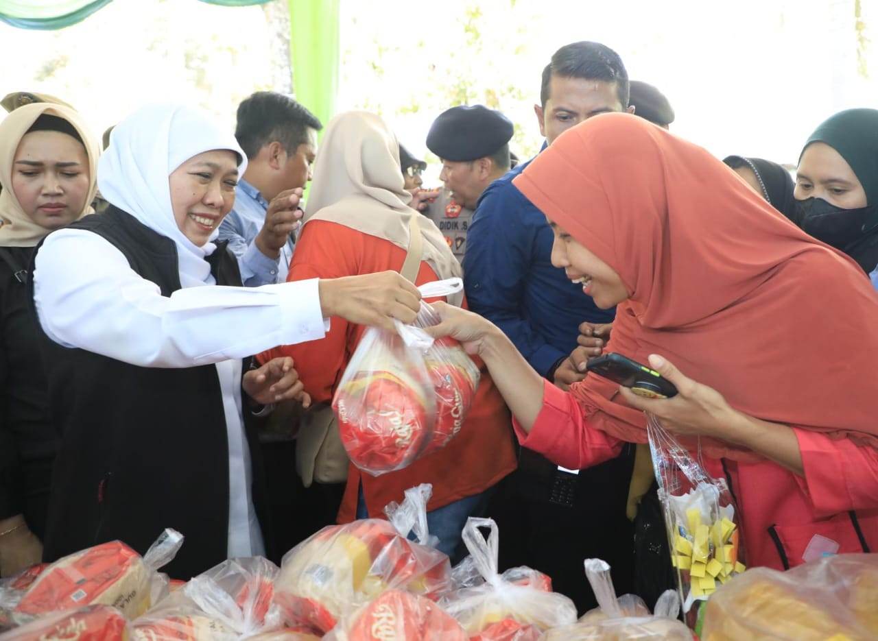 Gubernur Jawa Timur, Khofifah Indar Parawansa, meninjau secara langsung gelaran pasar murah dalam rangkaian HUT ke 78 Pemprov Jatim sekaligus menjaga stabilitas harga bahan pokok, yang dilaksanakan di Halaman Pendopo Kab. Bondowoso, Sabtu (16/9/2023).