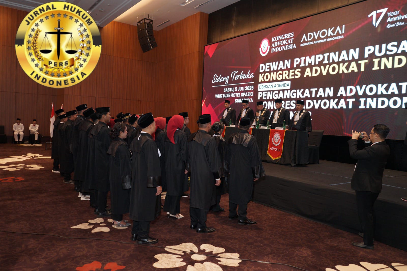Dewan Pimpinan Pusat Kongres Advokat Indonesia (DPP KAI) kembali mengukuhkan advokat baru melalui Sidang Terbuka dengan agenda Pengangkatan Advokat, yang berlangsung secara khidmat di Whiz Luxe Hotel Spazio Surabaya, Sabtu (5/7/2025).