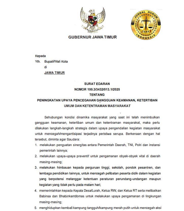 Gubernur Jawa Timur, Khofifah Indar Parawansa, menerbitkan Surat Edaran (SE) Nomor 100.3/3432/013.1/2025, berisi tentang Peningkatan Upaya Pencegahan Gangguan Keamanan, Ketertiban Umum, dan Ketenteraman Masyarakat. SE tersebut diterbitkan untuk mengatur dan menjaga suasana di Jawa Timur dari potensi terjadinya gangguan keamanan dan ketertiban.