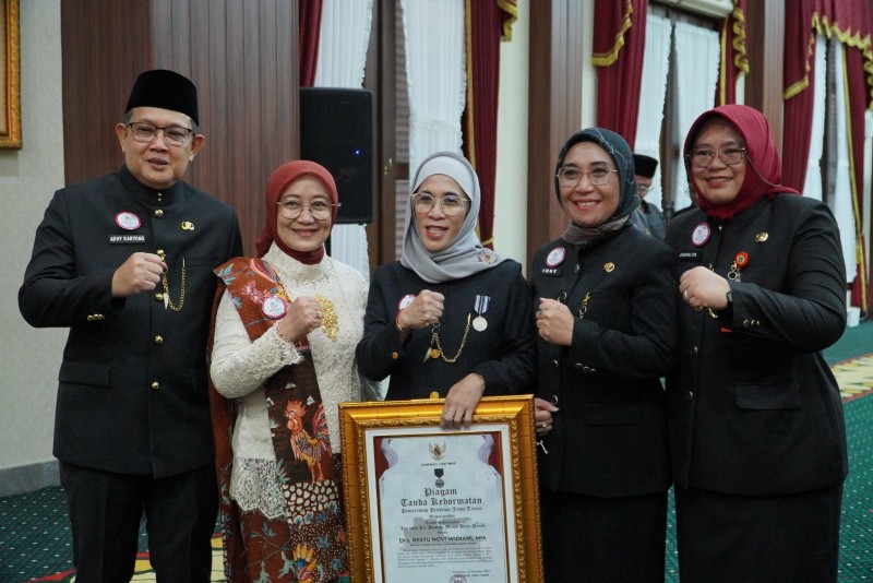 Kepala Dinas Sosial Provinsi Jawa Timur, Restu Novi Widiani juga menerima Anugerah Lencana Penghargaan Jer Basuki Mawa Beya (JBMB). Foto : Wahyu – JNR