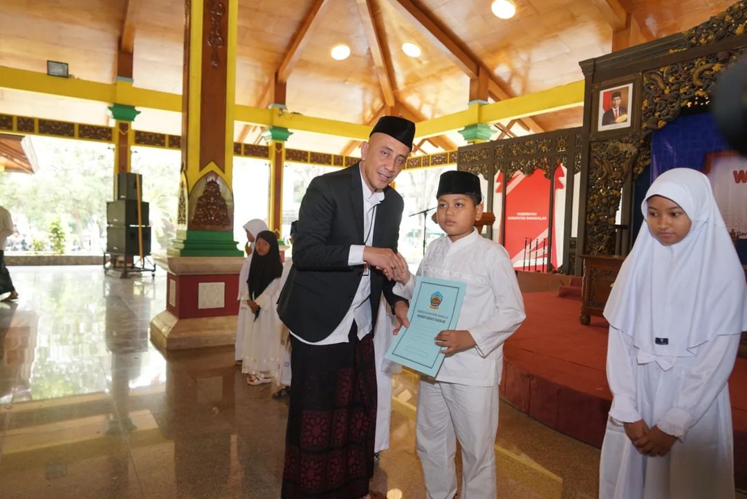 Usai menggelar Apel Hari Santri Nasional (HSN) tahun 2023, Penjabat (Pj) Bupati Bangkalan Arief M Edie memberikan penghargaan bagi 1000 penghafal Al-Qur’an Juz 30, di Pendopo Agung Bangkalan, Minggu (22/10/2023).