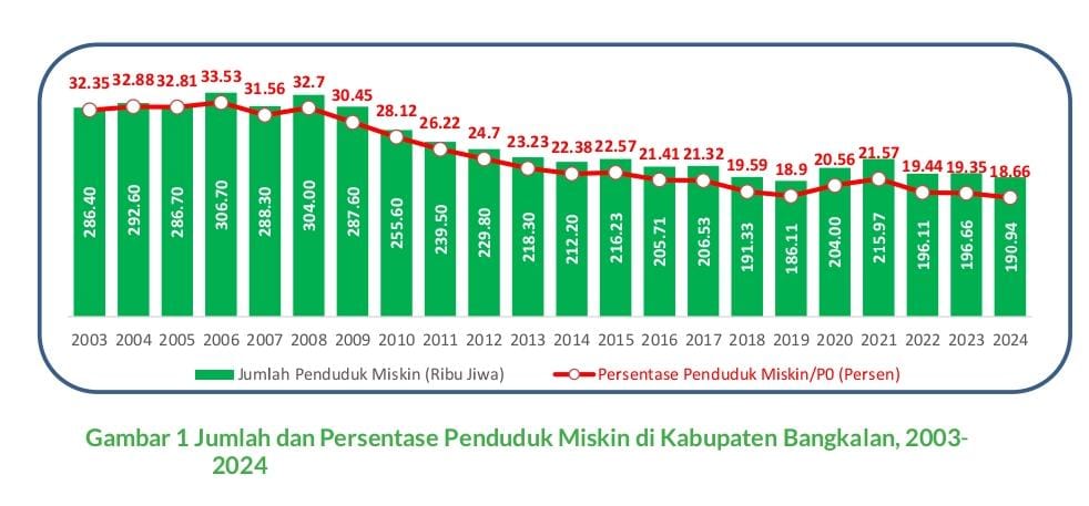 Kepala BPS Bangkalan Insaf Santoso mengatakan, selama periode Maret 2003 hingga Maret 2024, jumlah penduduk miskin di Kabupaten Bangkalan berkurang sebesar 89,74 ribu jiwa, dari 286,40 ribu menjadi 196,66 ribu jiwa, atau rata-rata penurunan sebesar 4,07 ribu jiwa per tahun.