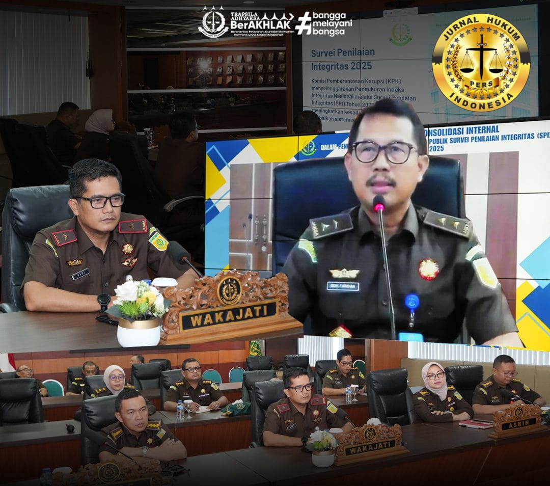 Wakil Kepala Kejaksaan Tinggi Jawa Timur, Dr. Hari Wibowo, S.H., M.H., didampingi Asisten Pembinaan, Asisten Tindak Pidana Umum, serta Asisten Pengawasan, mengikuti Sosialisasi dan Konsolidasi Internal Peningkatan Kualitas Pelayanan Publik melalui Survei Penilaian Integritas (SPI) Tahun 2025) secara daring di Ruang Rapat Kajati Jatim, Senin (13/10/2025).