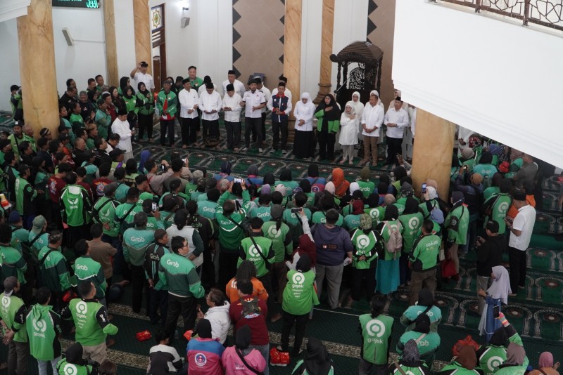 Sejak usai salat Subuh, jamaah mulai memadati area masjid. Para pengemudi ojol terlihat mengenakan jaket hijau khas komunitas mereka, sementara masyarakat umum hadir dengan busana putih sederhana. Mereka memenuhi halaman masjid, duduk bersila dalam suasana hening dan penuh keharuan.