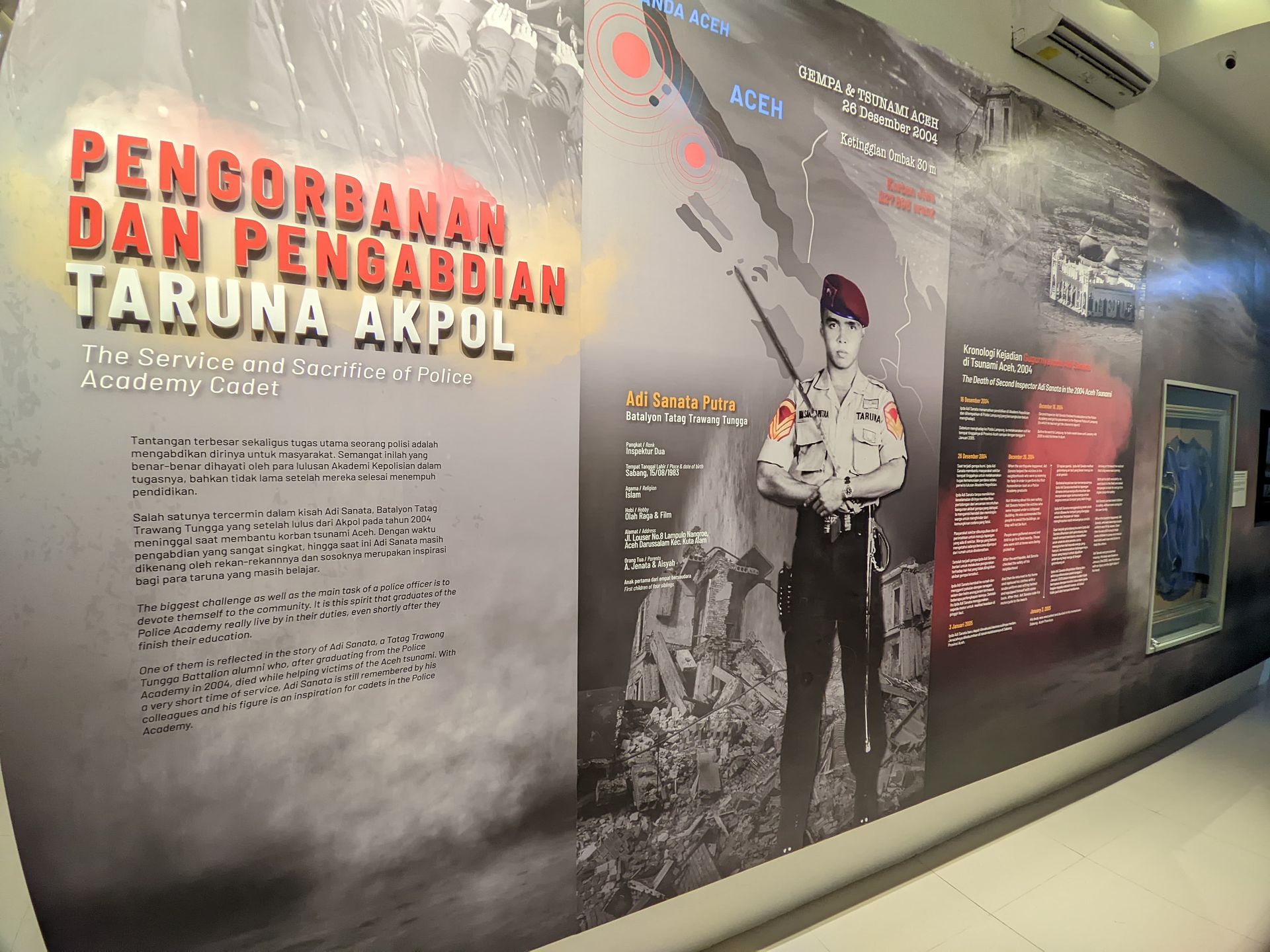“Saat terjadi gelombang Tsunami, Ipda Adi Sanata dihantam oleh gelombang dan masih sempat membantu menaikkan anak-anak ke atas perahu serta mengulurkan tali kepada warga yang hanyut, ia menempatkan batangan kayu besar yang hanyut untuk dijadikan pelampung bagi warga di tengah gelombang air,” jelas catatan di Museum Akpol.