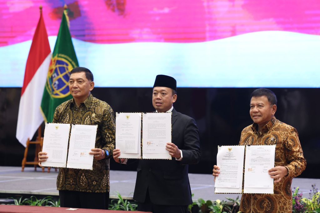 Menteri Pertahanan RI Sjafrie Sjamsoeddin bersama Menteri Agraria dan Tata Ruang/Kepala Badan Pertanahan Nasional (ATR/BPN) Nusron Wahid melakukan Penandatanganan Nota Kesepahaman antara Kementerian Agraria dan Tata Ruang/Badan Pertanahan Nasional dengan Kementerian Pertahanan Republik Indonesia, pada Kamis (14/11), di Jakarta. Penandatangan ini berlangsung dalam kegiatan Rapat Koordinasi Pencegahan dan Penyelesaian Tindak Pidana Pertanahan Direktorat Jenderal Penanganan Sengketa dan Konflik Pertanahan Tahun 2024.