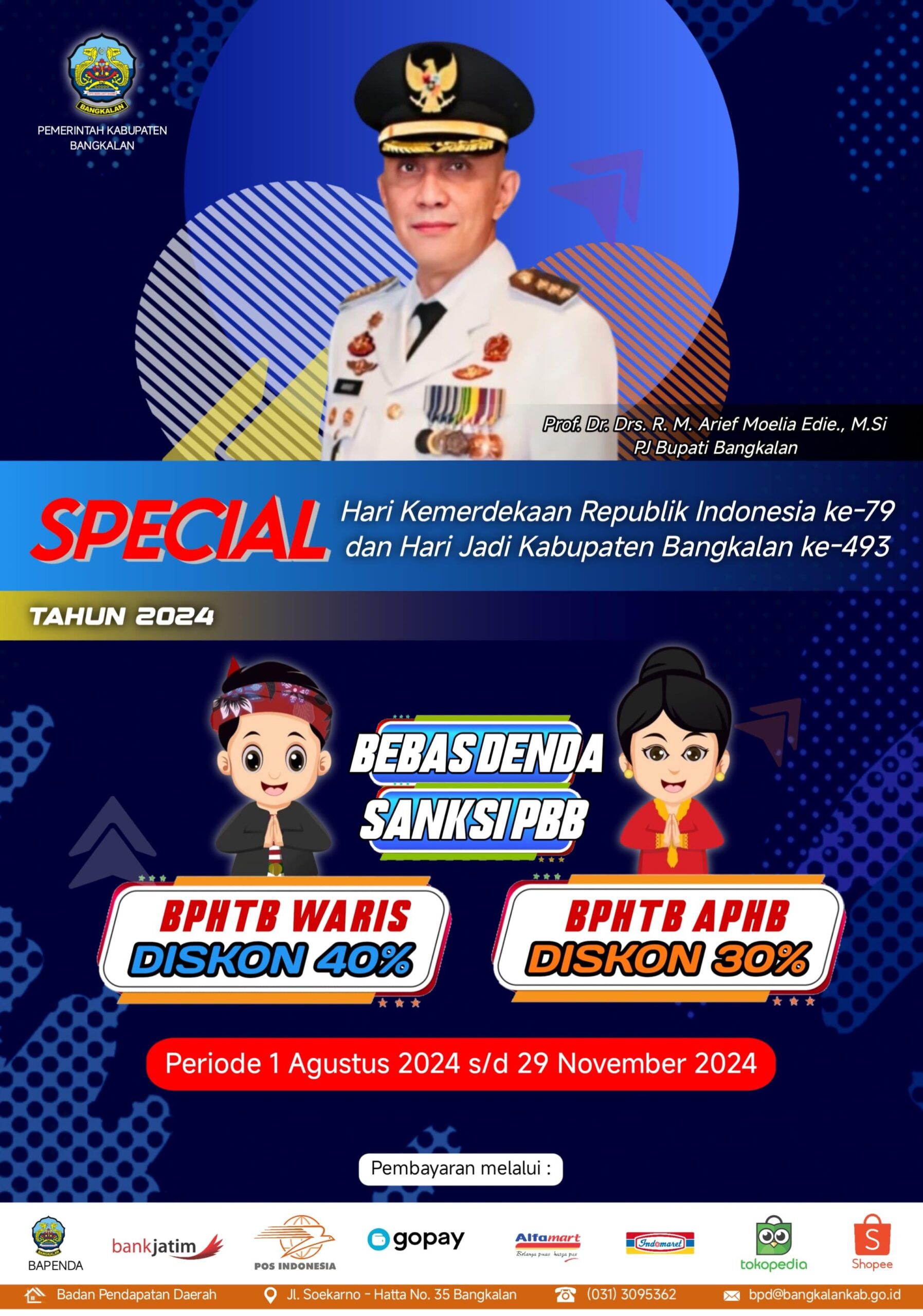Pembebasan denda pajak dan diskon BPHTB dilakukan dalam rangka hari kemerdekaan dan Hari Jadi Ke-493 Kabupaten Bangkalan.