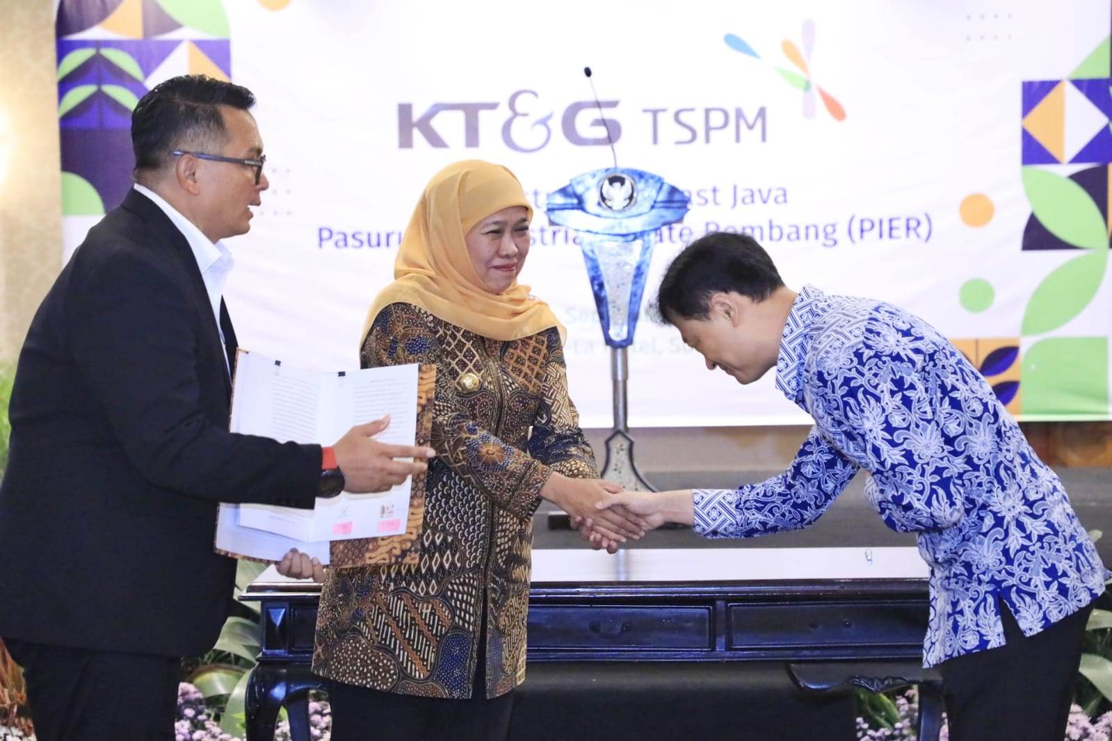 Gubernur Jawa Timur, Khofifah Indar Parawansa, menyaksikan secara langsung penandatanganan Perjanjian Penggunaan Tanah Industri (PPTI) antara Direktur PT Surabaya Industrial Estate Rungkut (SIER) Didik Prasetiyono dengan Wakil Direktur Utama PT. Tri Sakti Purwosari Makmur (TSPM) yang merupakan anak perusahaan Korea Tomorrow & Global Corporation (KT&G) Jang Jaehong, di Surabaya, Selasa, (19/9/2023).