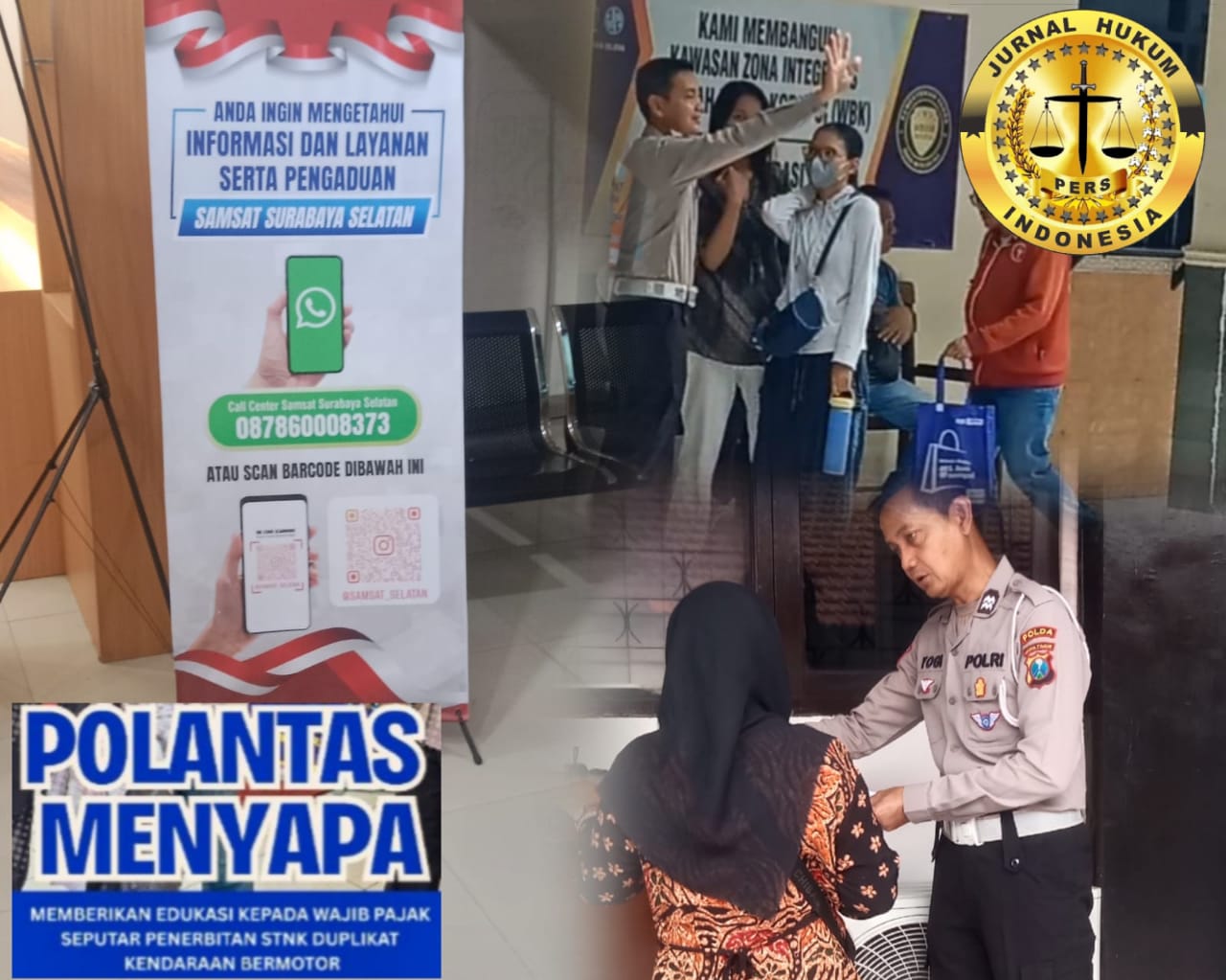 Hasil wawancara eklusis awak Media On Line Dengan Pamim Kantor Bersama Samsat Surabaya Selatan Rabu 4 /11/2025 Beliau memaparkan Melalui program “Polantas Menyapa”, Polda Jatim, khususnya Samsat Surabaya Selatan, memberikan ruang kepada masyarakat untuk mengakses informasi dan layanan pengaduan. Masyarakat dapat menghubungi Call Centre Samsat Surabaya Selatan di nomor 087860008373 untuk mendapatkan informasi dan bantuan terkait dengan layanan kepolisian.