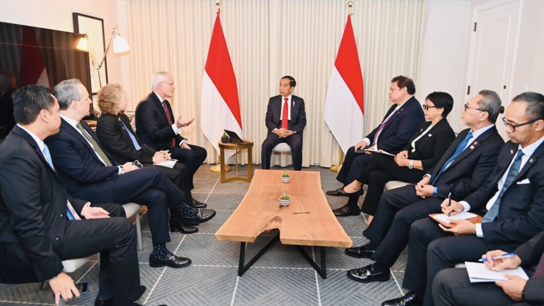 Presiden Joko Widodo menerima Chairman Exxon Mobil Corporation Darren Woods di Hotel Four Seasons, San Francisco, Amerika Serikat, Rabu (15/11/2023). Dalam pertemuan tersebut Presiden Joko Widodo mengapresiasi kerja sama pembangunan kilang petrokimia hijau.