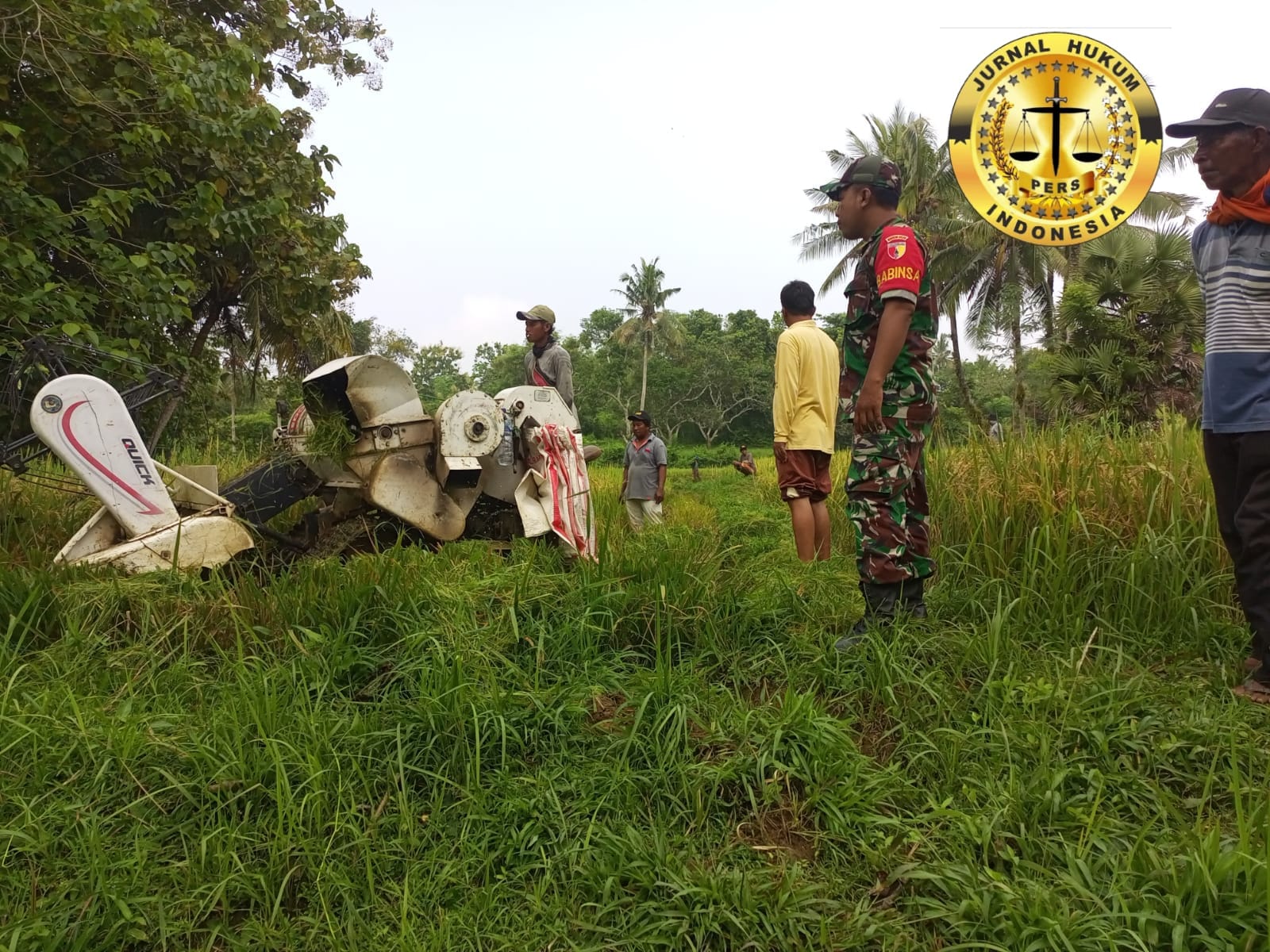 Babinsa Koramil 0829-18/kokop sertu Budi Aswin mendampingi proses panen padi di area lahan kelompok tani (Poktan) sumber mata bertempat di desa Dupok kecamatan Kokop kabupaten Bangkalan pada Kamis (17/4/25).