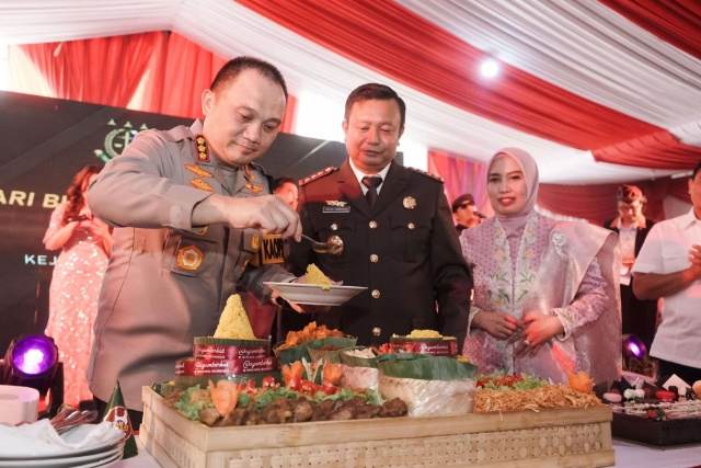 Kapolrestabes Surabaya, Kombespol Pasma Royce memberikan penghormatan berupa nasi tumpeng ke Kajari Surabaya di hari Bhakti Adhyaksa. (Dok. Humas Polrestabes Surabaya)