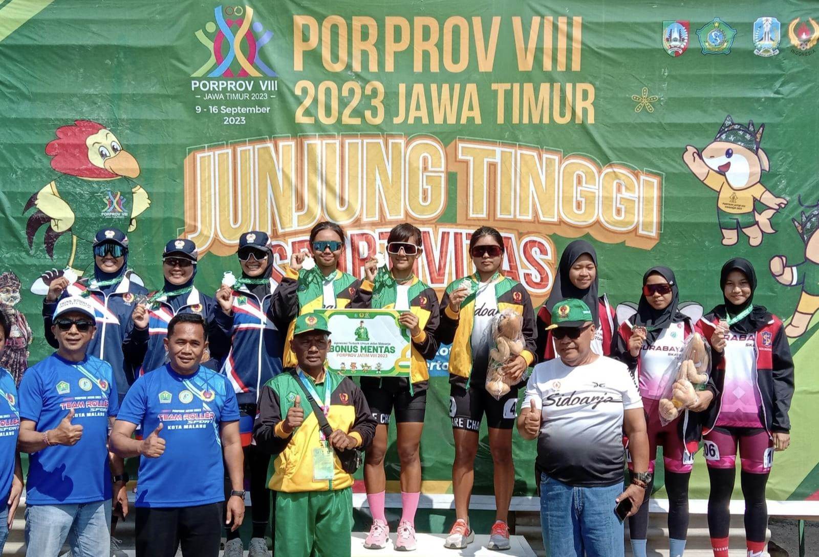 Ketua Umum Perserosi Sidoarjo, Doso Wardoyo (topi merah) saat berfoto bersama pemenang nomor 3000 m relay putri.