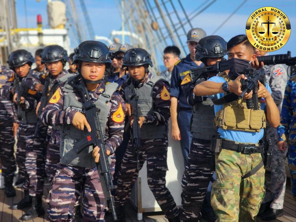 Saat melaksanakan lintas laut (Linla) menuju Penang Malaysia dalam rangka pelayaran Muhibah Diplomasi Duta Bangsa dan Latihan praktek (Lattek) Kartika Jala Krida (KJK) Tahun 2025, peserta ASEAN Plus Cadet Sail (APCS) 2025 melakukan latihan Visit Board Search Seizure (VBSS), yang diselenggarakan di atas Geladak KRI Bima Suci. Selasa (12/8).