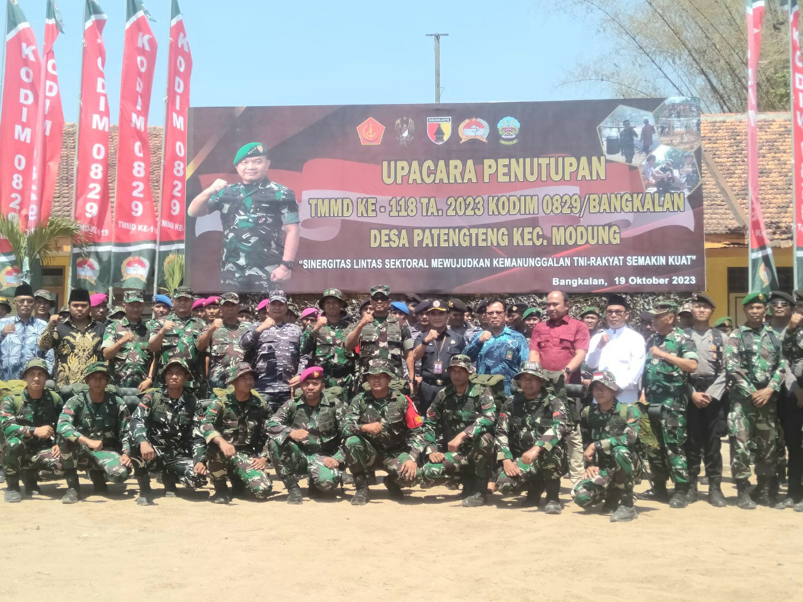 Upacara Penutupan TNI Manunggal Membangun Desa (TMMD) Ke- 118 tahun 2023 dengan tema *”Sinergitas Lintas Sektoral Mewujudkan Kemanunggalan TNI-Rakyat Semakin Kuat”,* bertindak sebagai Irup Danrem 084/BJ Brigjen TNI Terry Tresna Purnama, S.I. Kom, M.M., dan Komandan Upacara Kapten Inf Edy Kuswoyo Hadi (Danramil 0829-04/Burneh) yang diikuti oleh 1. 1 SST Kodim 0829/Bangkalan, 1 SST Yonif Mekanis 516/CY, 1 SST Gabungan Lantamal V dan Lanal Batuporon, 1 SST Gabungan Pasmar 2 dan Lanud Moeljono, 1 SST Polres Bangkalan, 1 SST Satpol PP Kab. Bangkalan, 1 SST Dishub Kab. Bangkalan, 1 SST Siswa SMA, SMK (Pramuka) dan 1 SST Satsik Kodam V/BRW.