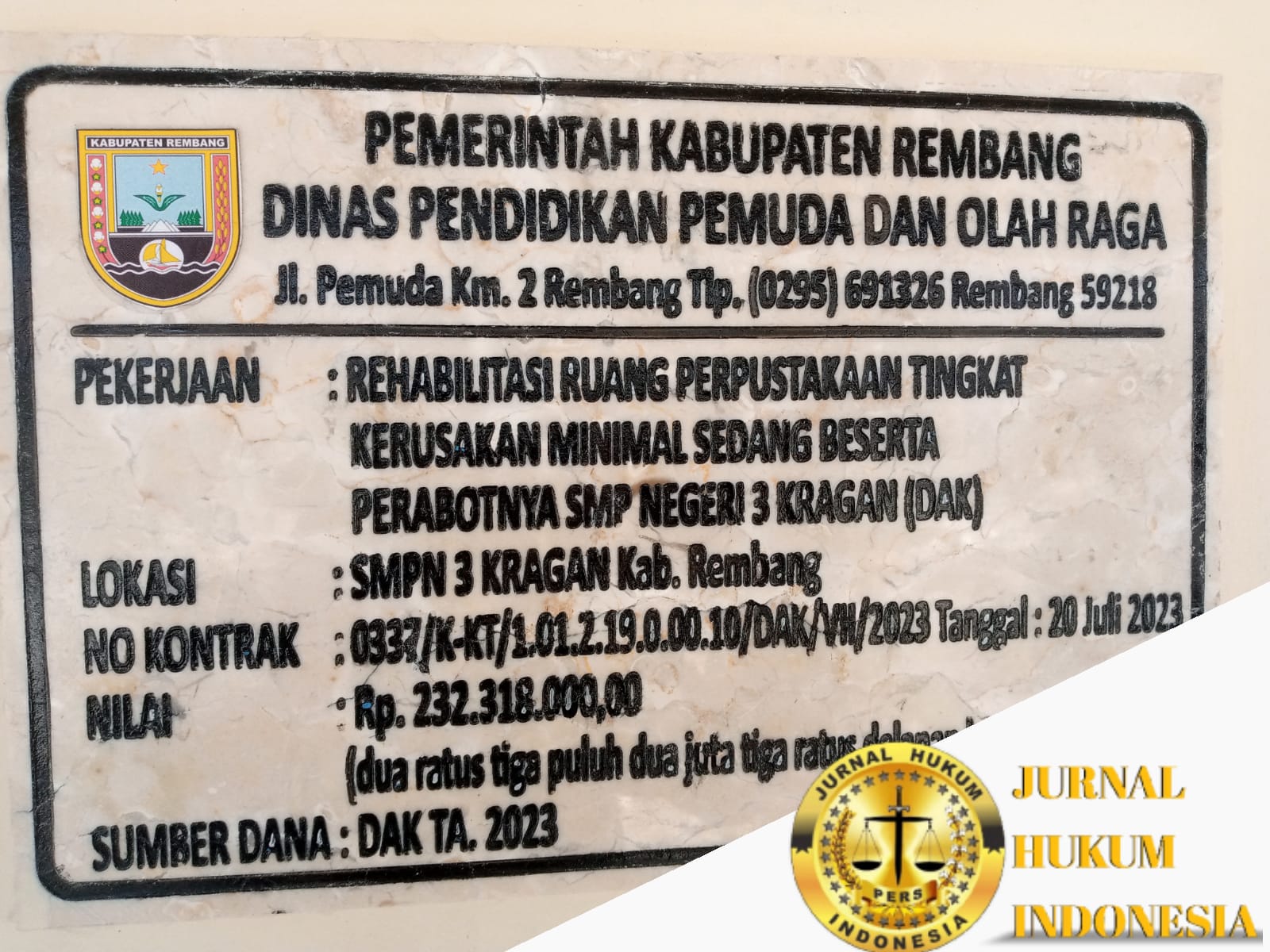 Rembang, jurnalhukumindonesia.id – Rehabilitasi ruang perpustakaan dengan tingkat kerusakan minimal SMPN 3 Kragan telan anggaran 232 juta lebih.